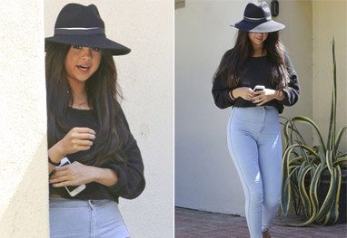 Selena optou por um look básico, mas elegante: jeans básico, camisão preto e um chapéu bem charmoso.